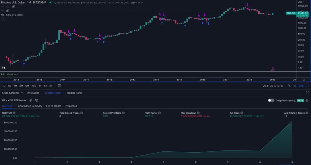 The RR BTC KISS Model is a straightforward, yet effective, approach to trading Bitcoin. The name, KISS, stands for "Keep It Simple, Stupid" and reflects the model's philosophy of using momentum as the primary driver of trades. This model is designed for traders who want to minimize the complexity of their strategy while still achieving excellent returns.